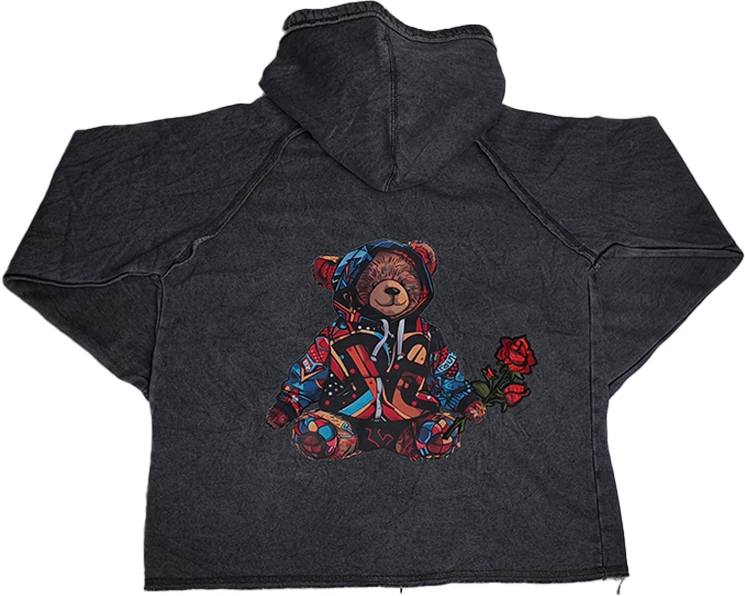 Stand out with the Custom Teddy Rose Hoodie featuring a vibrant teddy bear graphic holding a rose on the back and embroidered rose details on the front pocket. Made with premium washed fabric for a relaxed fit that blends comfort and street style.