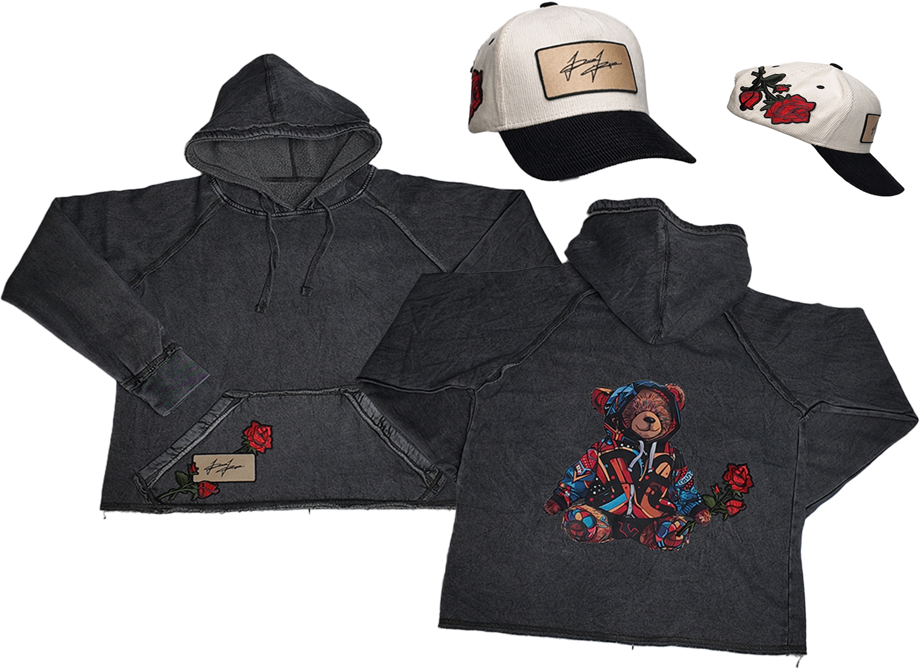 Level up your streetwear with this exclusive bundle — the Custom Teddy Rose Hoodie + Rose Patch Corduroy Hat. The hoodie features a bold teddy graphic holding a rose on the back with embroidered rose details on the front, while the hat ties it all together with matching rose embroidery and signature patch. Perfectly paired for only $75.