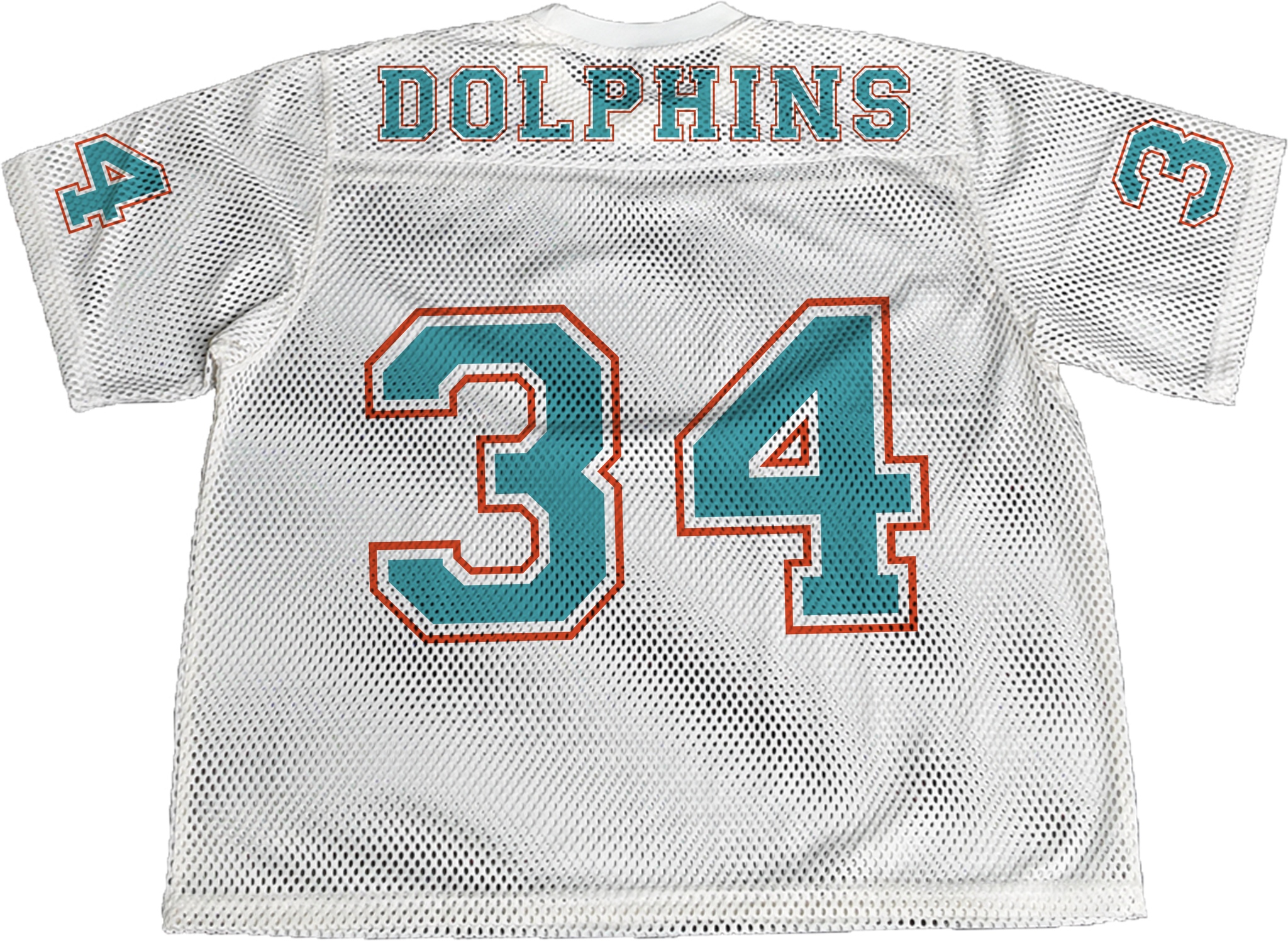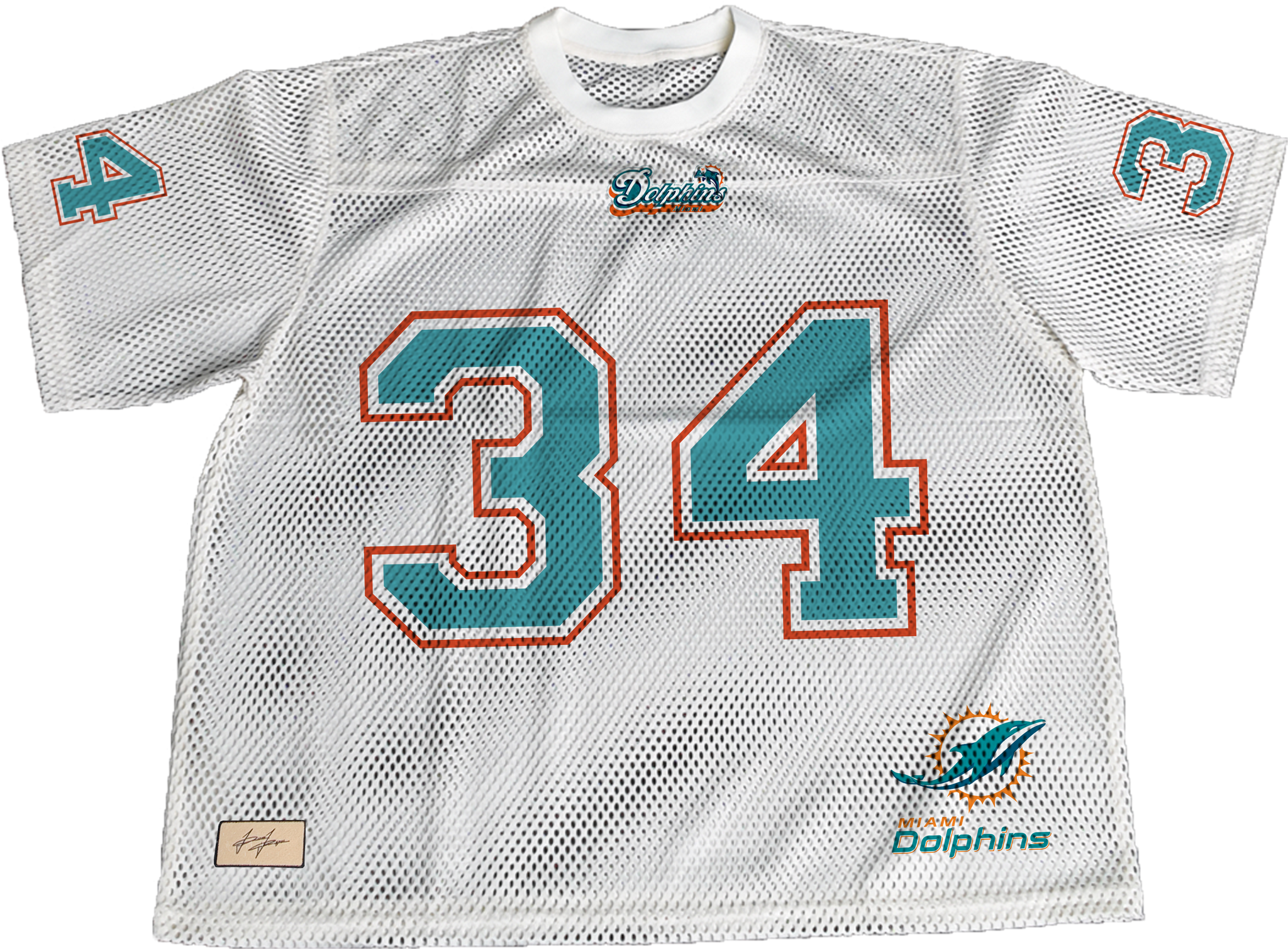 Rep your team spirit with this custom Miami Dolphins jersey, designed as a one-of-one piece for true fans who want something unique. Crafted with breathable white mesh fabric, this jersey features bold teal and orange #34 graphics on the front, back, and sleeves, making it a standout piece for game days, tailgates, or streetwear styling.